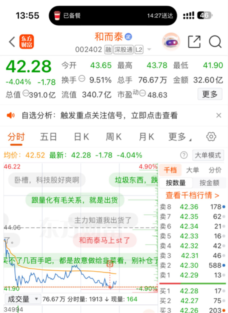 $和而泰(SZ002402)$ 下跌背离了,等了一整天终于有机会出手了!