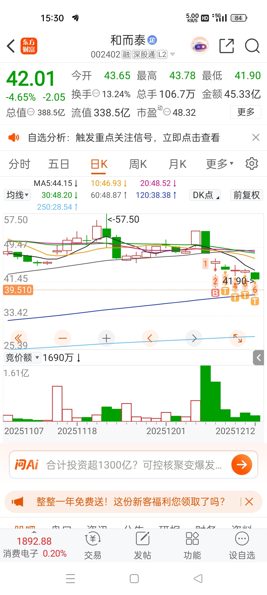 $和而泰(SZ002402)$ 你们要做T,不做T主力就砸晕你们,我跟你们一样入场时间,我成本应该比你们低,考验你们操盘能力。