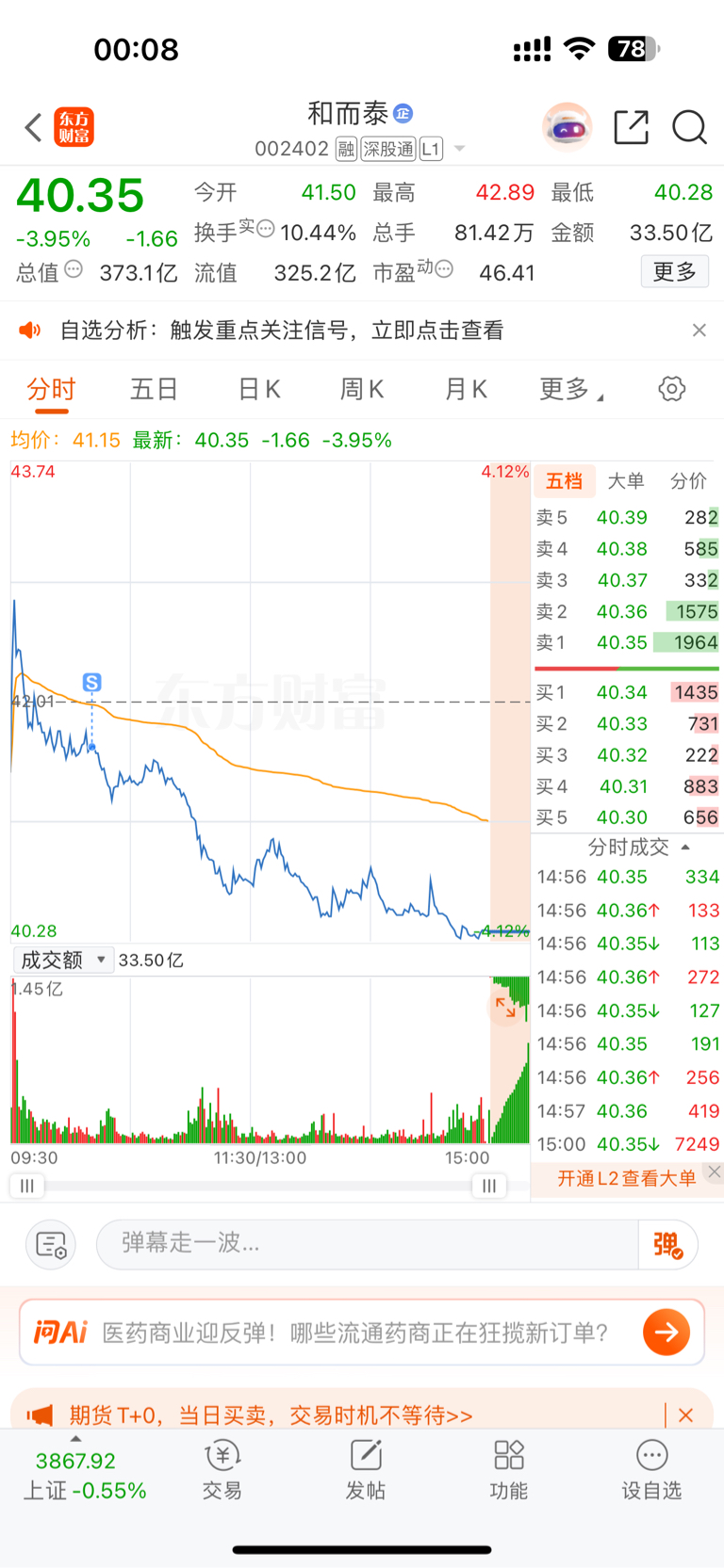 $和而泰(SZ002402)$ 今天果断割肉清仓,亏了我4个多点,主力资金净流出约 2.94亿元,目前正处于“情绪退潮期”,短期趋势转弱,正在寻找新的平衡点,“摩尔线程”概念炒作热度正在消散,资金开始兑现利润。
