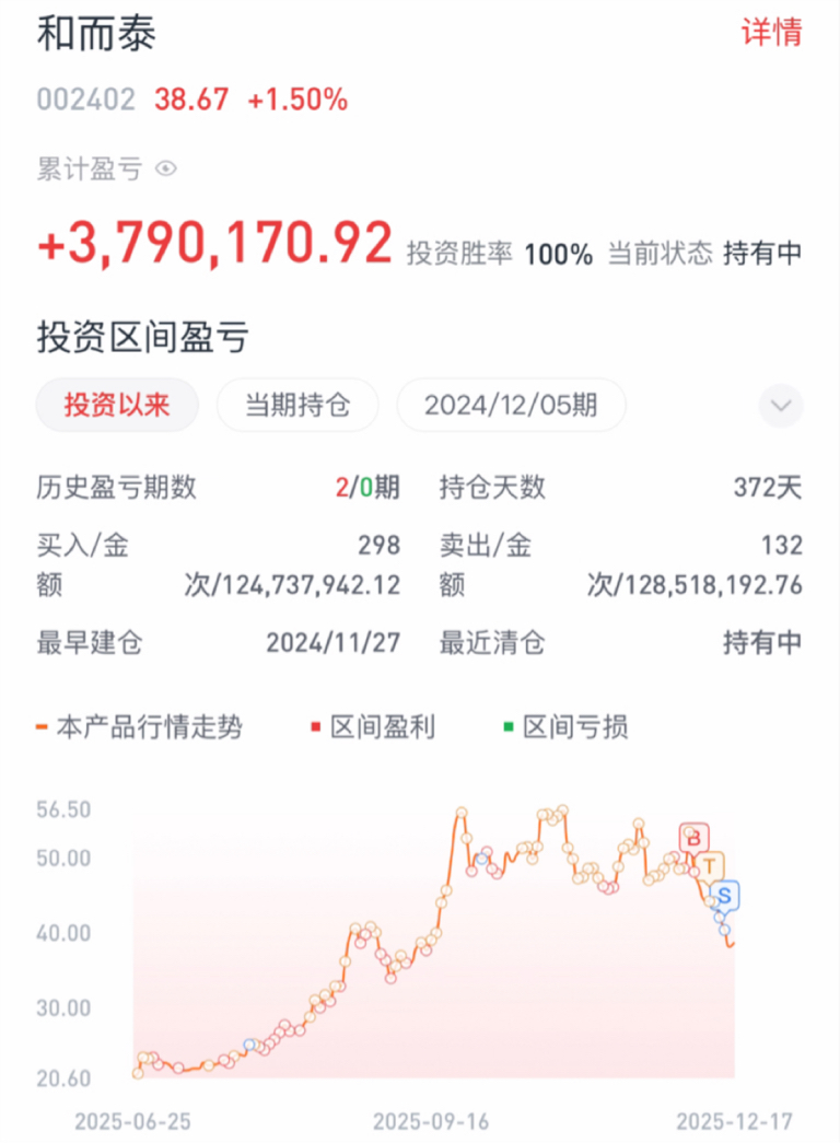 感恩股友并肩同行,持仓374天,曾擒获320%收益、浮盈突破500个,其多维优势始终让人坚定持有信心目标70元。可大A下和而泰很神奇,竟然破位回吐至380个。感恩这份投资馈赠,感恩每一位同行股友的并肩坚守,温暖且有力量。因个人年前资金周转,今日暂别和而泰。愿各位股友平安喜乐,投资顺遂、个个盈利,待蓄力完成下一支潜力股,再携手埋伏,共启新盈利篇章!老友们盈利了吗?