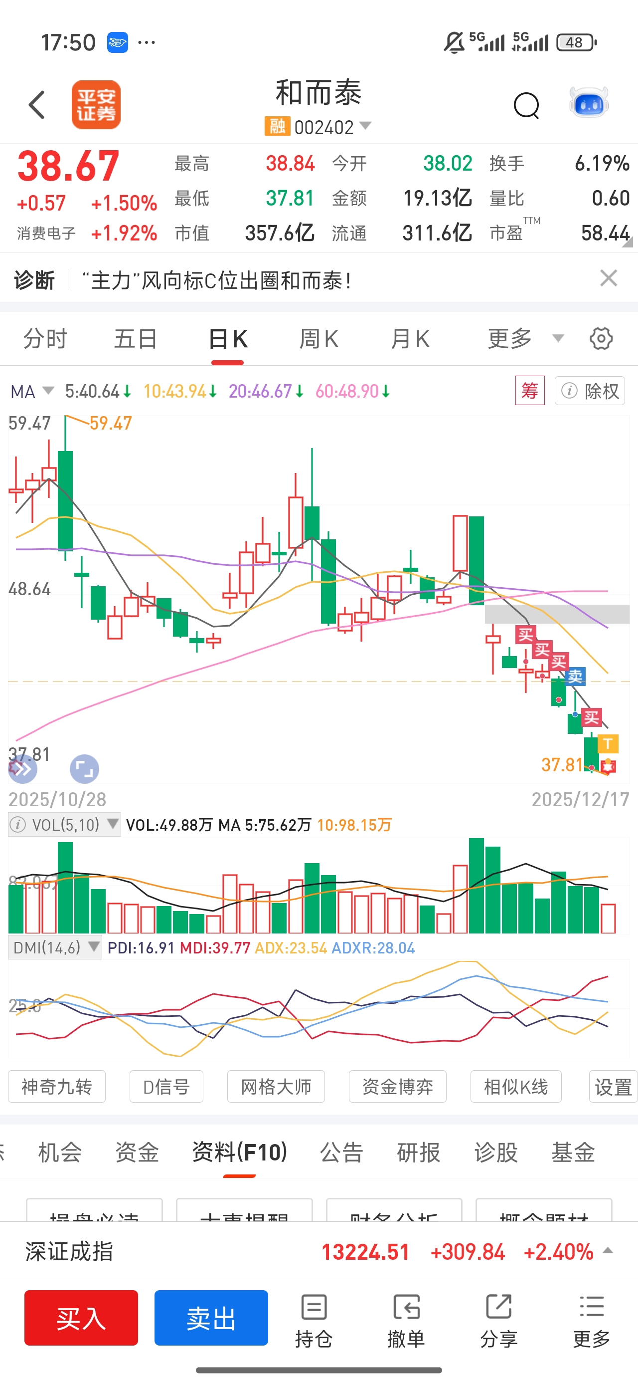 今天大盘涨这么多,自选里很多都涨停了唯独和而泰还是涨这么一点,你们看他从五十几每