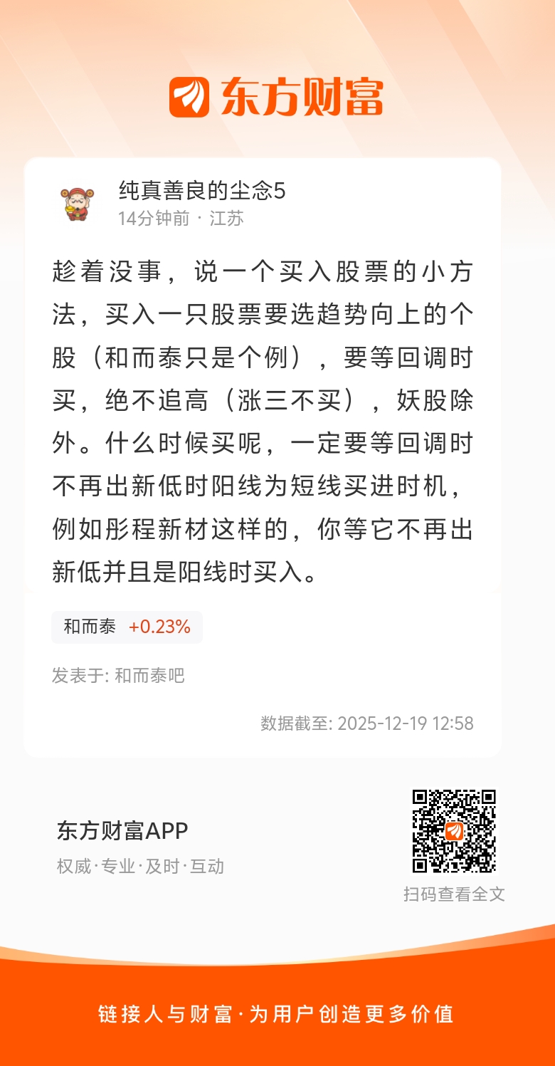 趁着没事,说一个买入股票的小方法,买入一只股票要选趋势向上的个股(和而泰只是个例),要等回调时买,绝不追高(涨三不买),妖股除外。什么时候买呢,一定要等回调时不再出新低时阳线为短线买进时机,例如彤程新材这样的,你等它不再出新低并且是阳线时买入。