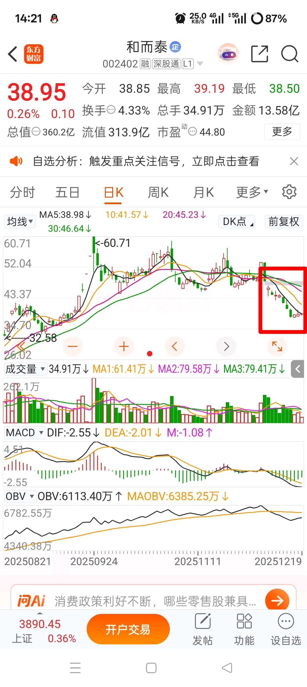 $和而泰(SZ002402)$ 没什么希望,均线空头向下发散,且量能萎靡不振,这个地方可能会有反弹,大概反弹至44块钱左右,中长期下跌趋势不变。