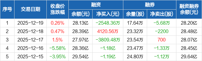 融资方面,当日融资买入1.12亿元,融资偿还1.37亿元,融资净偿还2548.36万元。融券方面,融券卖出400股,融券偿还5.72万股,融券余量17.64万股,融券余额687.08万元。融资融券余额合计28.2亿元。