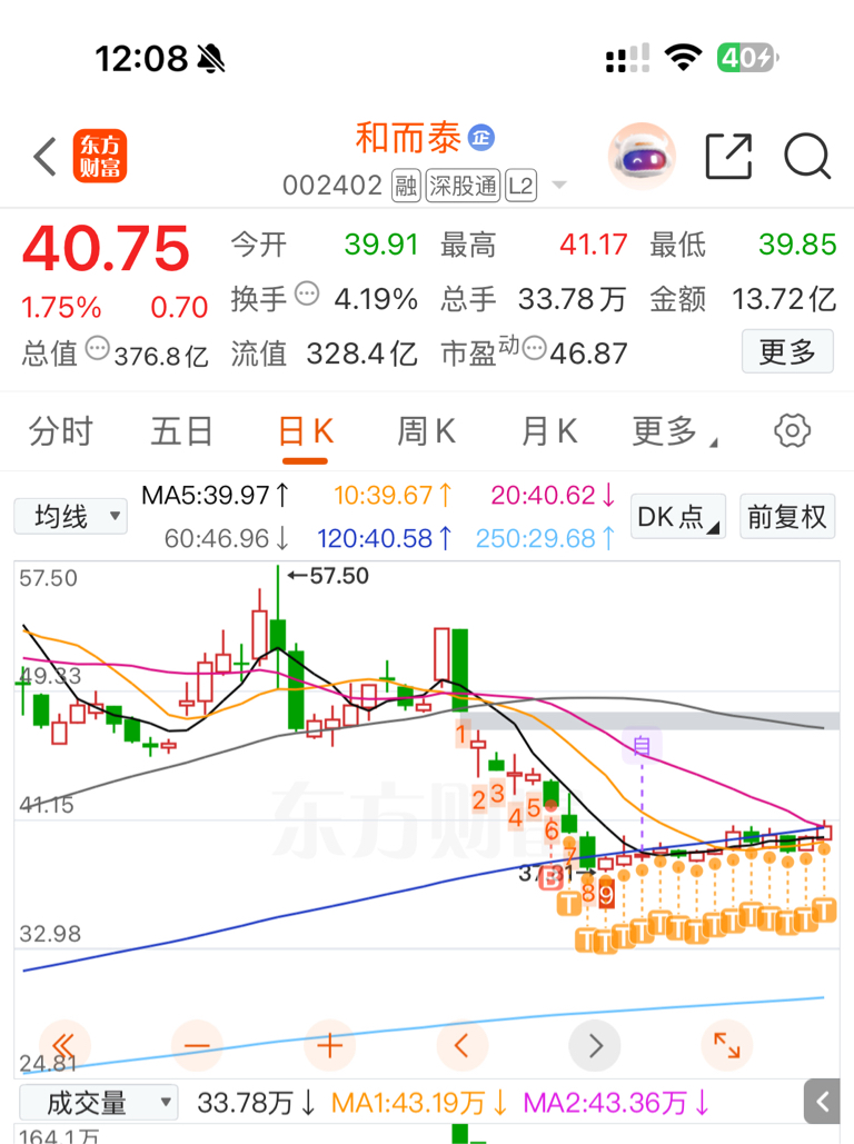 $和而泰(SZ002402)$ 腻麻麻的,今天总算回本了,12号在天际股份和你中间买的你,让我最近错失大肉,65个点,而且这个庄很阴间,每天0.5个点上下波动让我这种t神都t不动,每天2-3毛钱就得t了,不过还好今天回本了,我的原则是不赚钱不卖,无非就是跟庄家拼耐心,大家都有时间成本看谁熬得过谁。