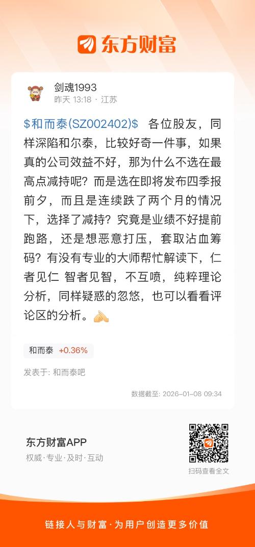 $和而泰(SZ002402)$ 各位股友,同样深陷和尔泰,比较好奇一件事,如果真的公司效益不好,那为什么不选在最高点减持呢?而是选在即将发布四季报前夕,而且是连续跌了两个月的情况下,选择了减持?究竟是业绩不好提前跑路,还是想恶意打压,套取沾血筹码?有没有专业的大师帮忙解读下,仁者见仁 智者见智,不互喷,纯粹理论分析,同样疑惑的忽悠,也可以看看评论区的分析。