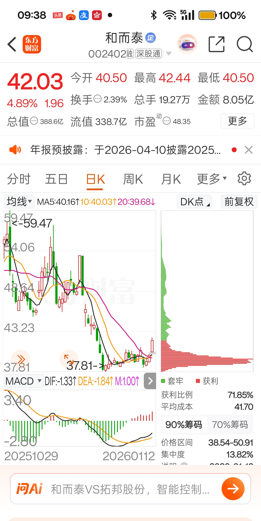 $和而泰(SZ002402)$ 压力位,42.80