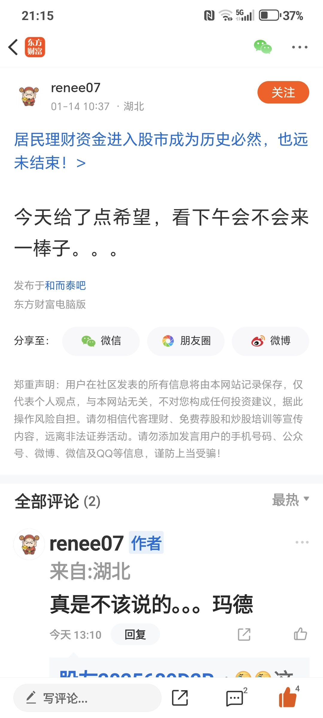 温馨提示: 1.根据《证券法》规定,禁止编造、传播虚假信息或者误导性信息,扰乱证券市场;2.用户在本社区发表的所有资料、言论等仅代表个人观点,与本网站立场无关,不对您构成任何投资建议。用户应基于自己的独立判断,自行决定证券投资并承担相应风险。《东方财富社区管理规定》