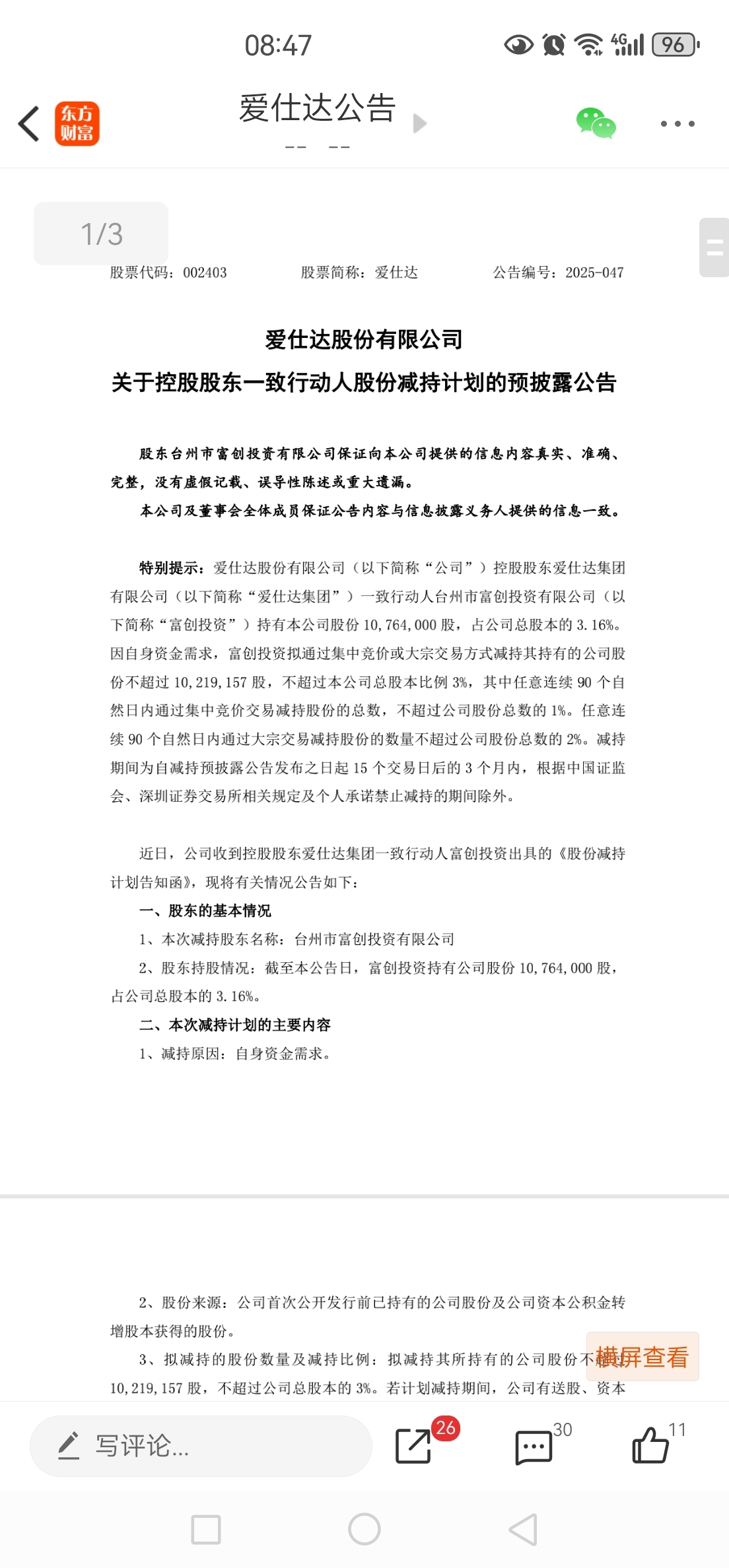$爱仕达(SZ002403)$ 9月中旬发布减持公告到现在也没个进展公告。宣布减持之后,一直跌到现在。
