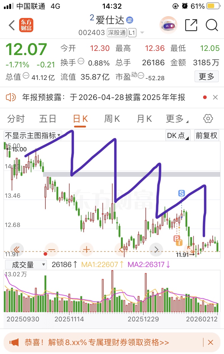 $爱仕达(SZ002403)$ 我发现这股有个特征,往上翘的阶梯 会 持续下走。往下翘的阶梯会 持续上走。现在就是往上翘的阶梯,再往下走。
