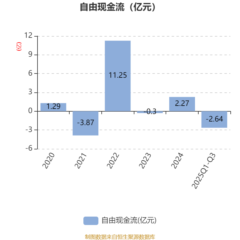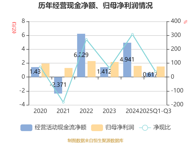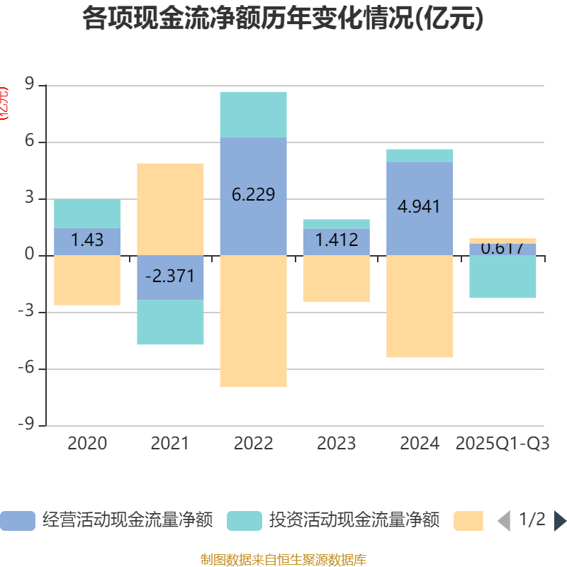 2025年前三季度,公司经营活动现金流净额为6174.94万元,同比下降83.63%;筹资活动现金流净额2773.64万元,同比增加5亿元;投资活动现金流净额-2.26亿元,上年同期为-2664.72万元。