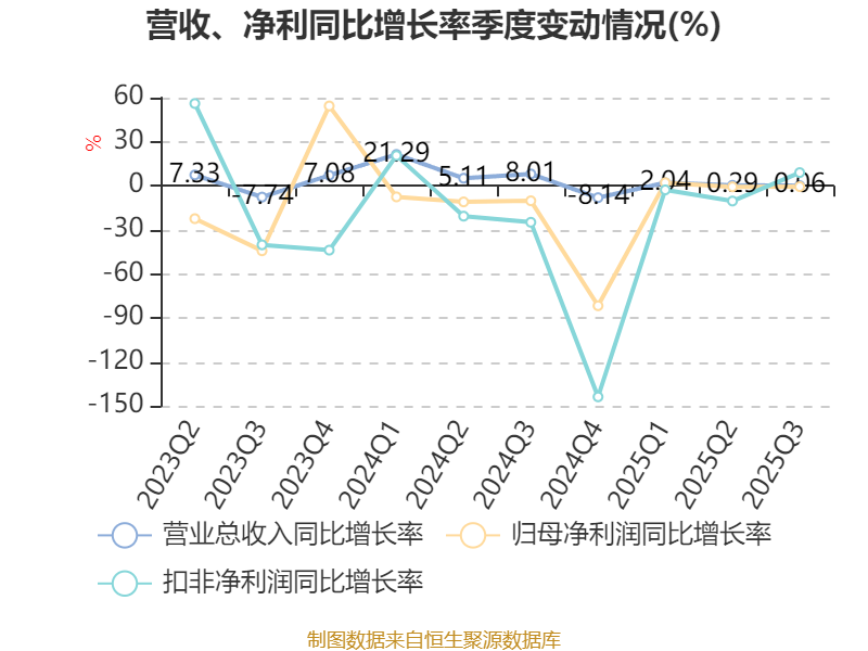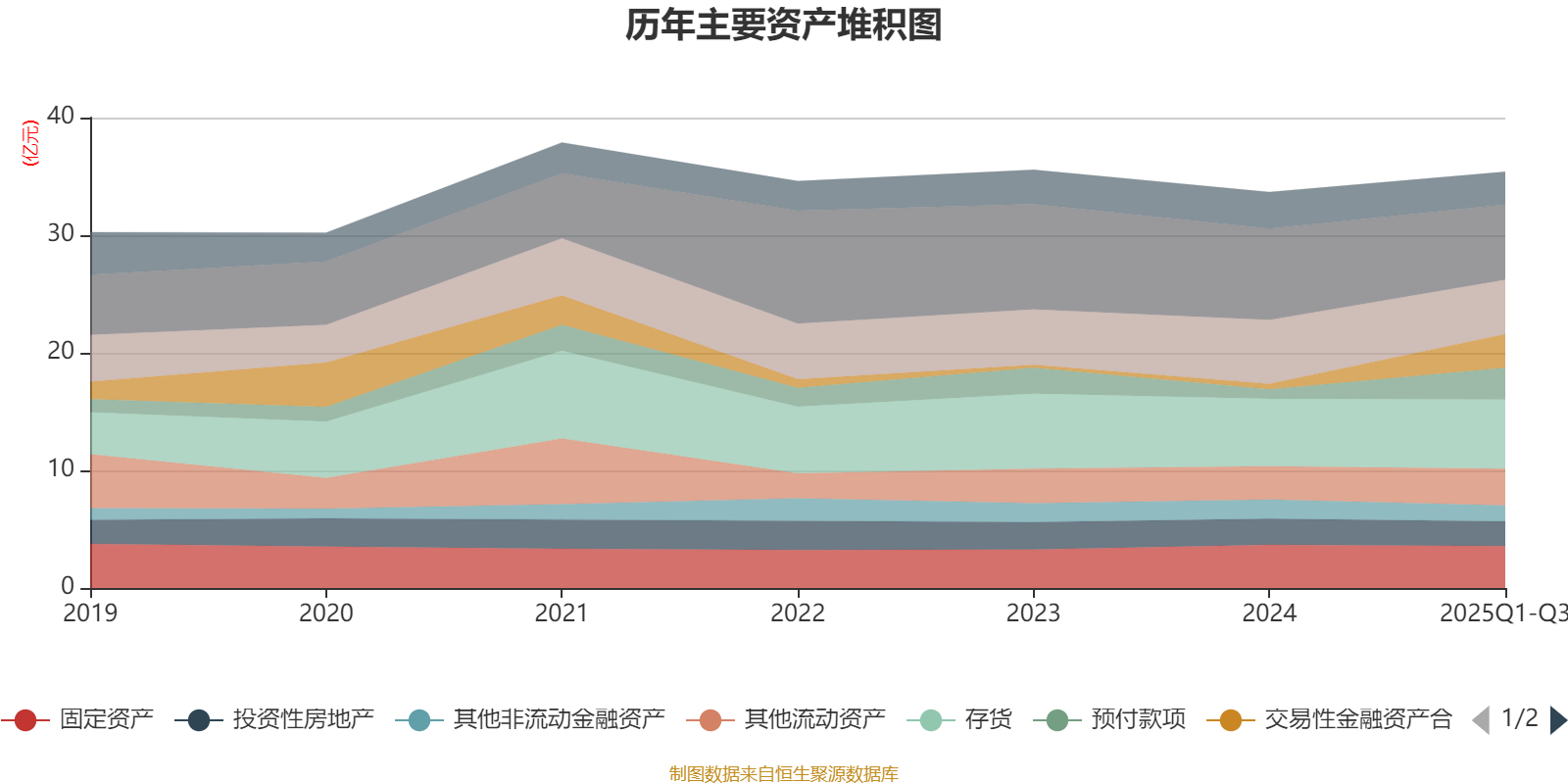 资产重大变化方面,截至2025年三季度末,公司交易性金融资产合计较上年末增加525.59%,占公司总资产比重上升6.75个百分点;预付款项较上年末增加226.48%,占公司总资产比重上升5.16个百分点;货币资金较上年末减少17.59%,占公司总资产比重下降4.98个百分点;应收票据及应收账款较上年末减少15.24%,占公司总资产比重下降3.12个百分点。