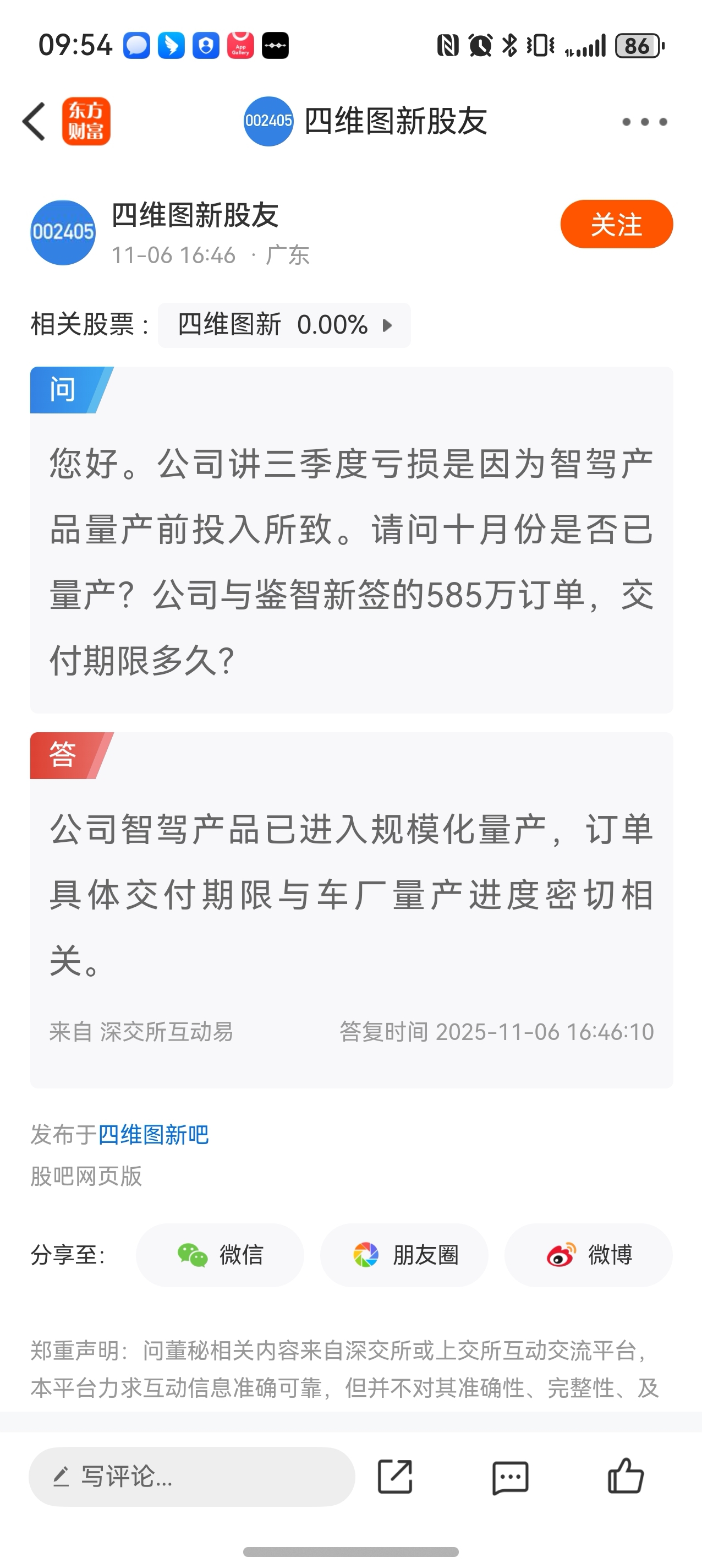 $四维图新(SZ002405)$ 董秘都说了三季度亏损由于智驾产品量产前投入所致,不是因为经营不善,市场份额丢失导致的,这一方面也告诉了投资者公司正向好的方向发展,财报营收只是后置而已,不要在无脑唱空了,本来这走势就很磨人恶心,还来了你们这一群玩意,和你们同在四维车上真是悲剧