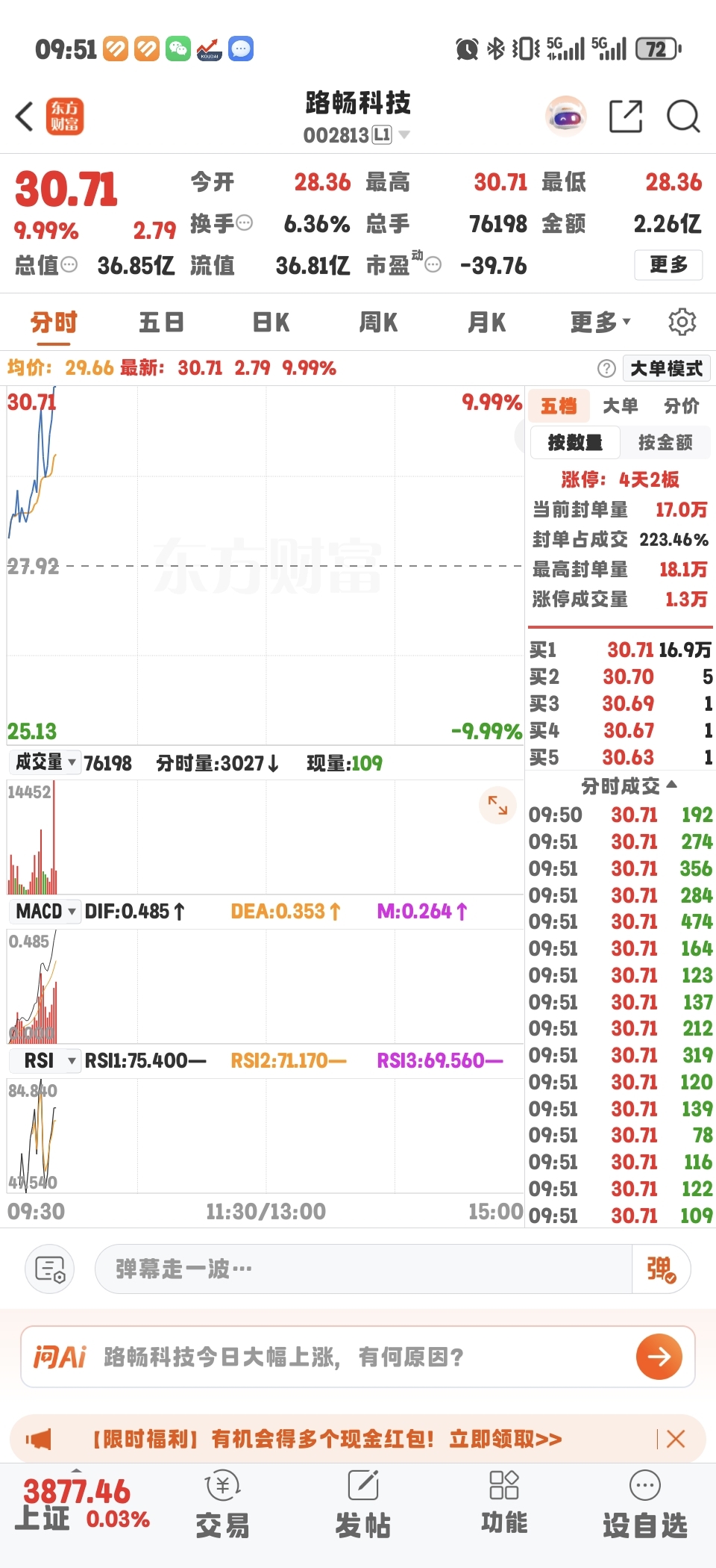 $四维图新(SZ002405)$ 首板又吃肉了