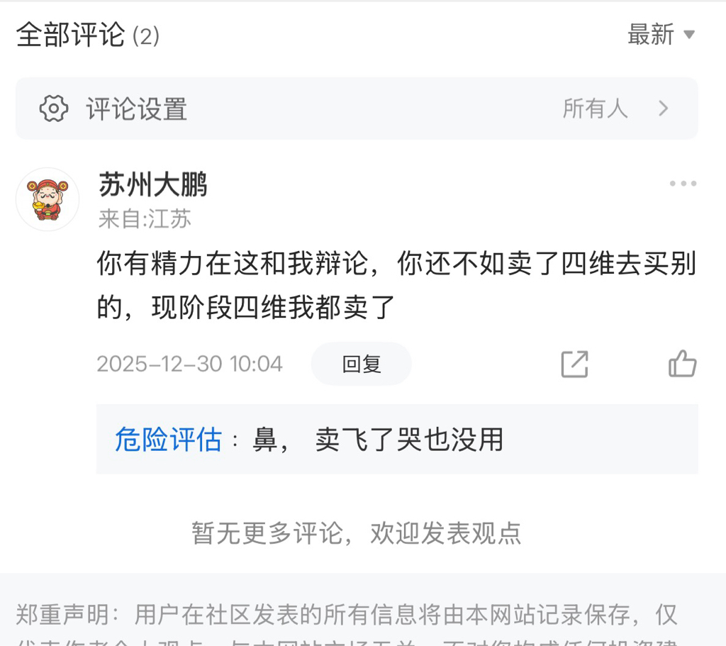 温馨提示: 1.根据《证券法》规定,禁止编造、传播虚假信息或者误导性信息,扰乱证券市场;2.用户在本社区发表的所有资料、言论等仅代表个人观点,与本网站立场无关,不对您构成任何投资建议。用户应基于自己的独立判断,自行决定证券投资并承担相应风险。《东方财富社区管理规定》