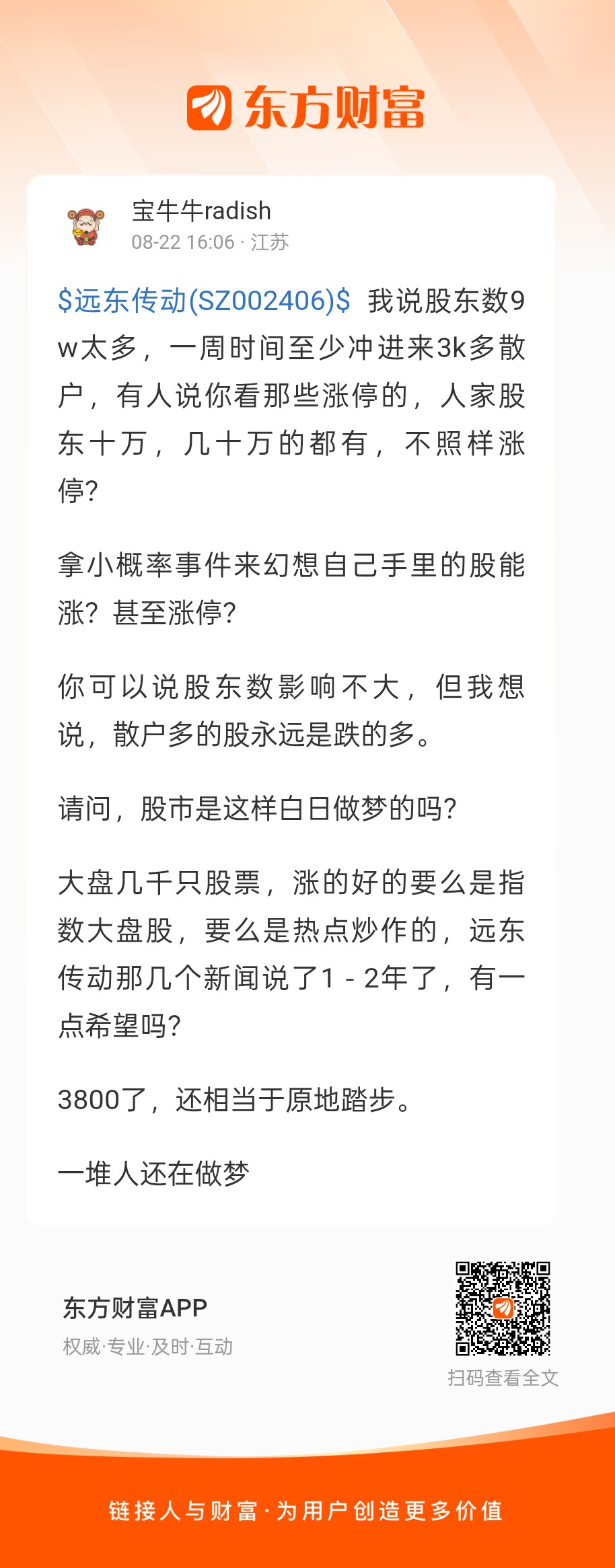 $远东传动(SZ002406)$ 我说股东数9w太多,一周时间至少冲进来3k多散户,有人说你看那些涨停的,人家股东十万,几十万的都有,不照样涨停?