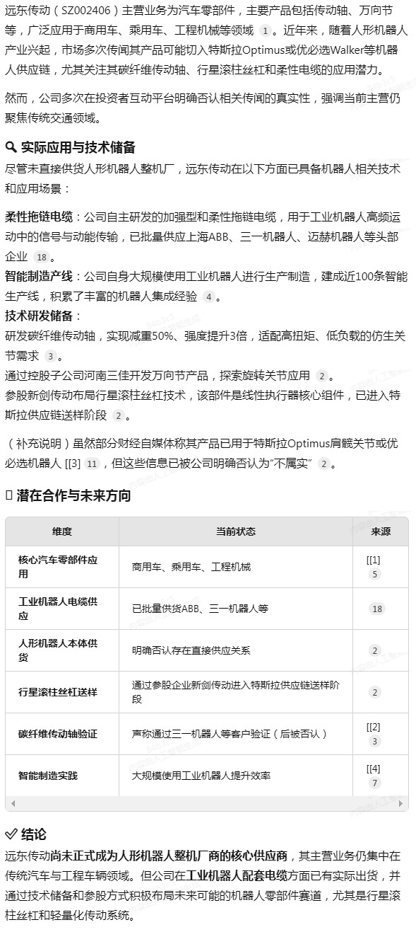 远东传动目前未正式确认其核心产品(如传动轴、万向节)已批量供应人形机器人客户,但公司在工业自动化领域已有深入实践,并探索向机器人零部件转型的可能性。