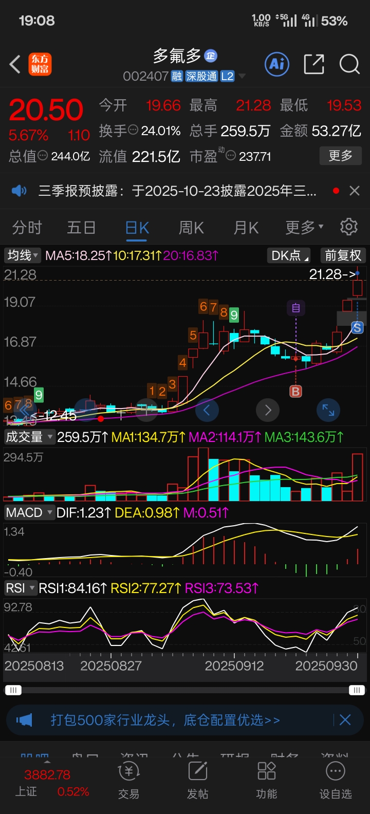$多氟多(SZ002407)$ 月底走势不及预期走了,连板都是市值比较小一点柚子主导的龙头,超买区短期获利盘打压有点厉害,国庆的利好希望能逆转这个局面,虽然下车了但也希望车上的兄弟发财。