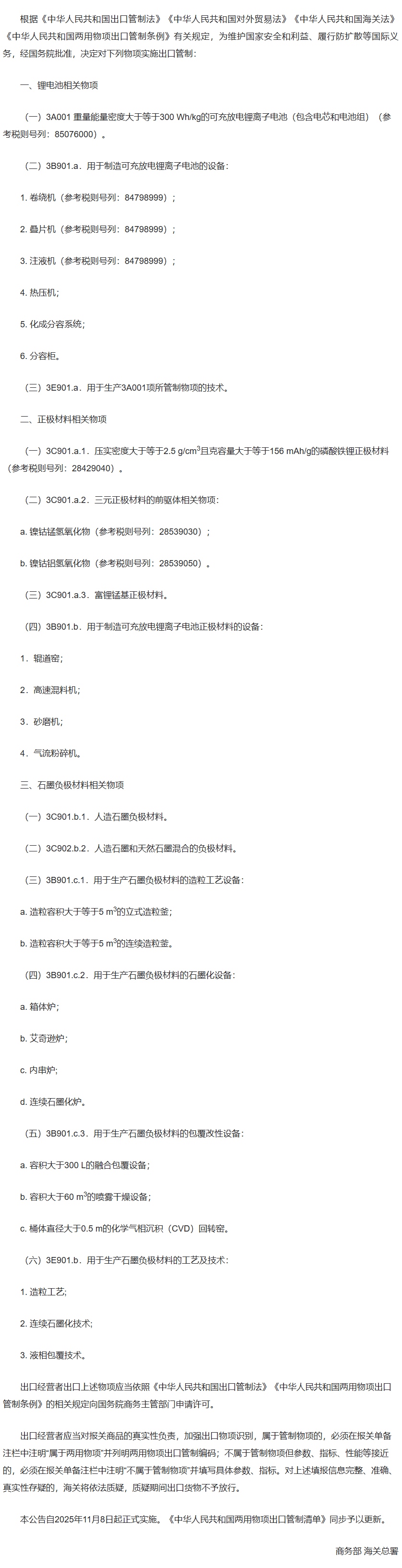 商务部、海关总署公布对锂电池和人造石墨负极材料相关物项实施出口管制的决定。