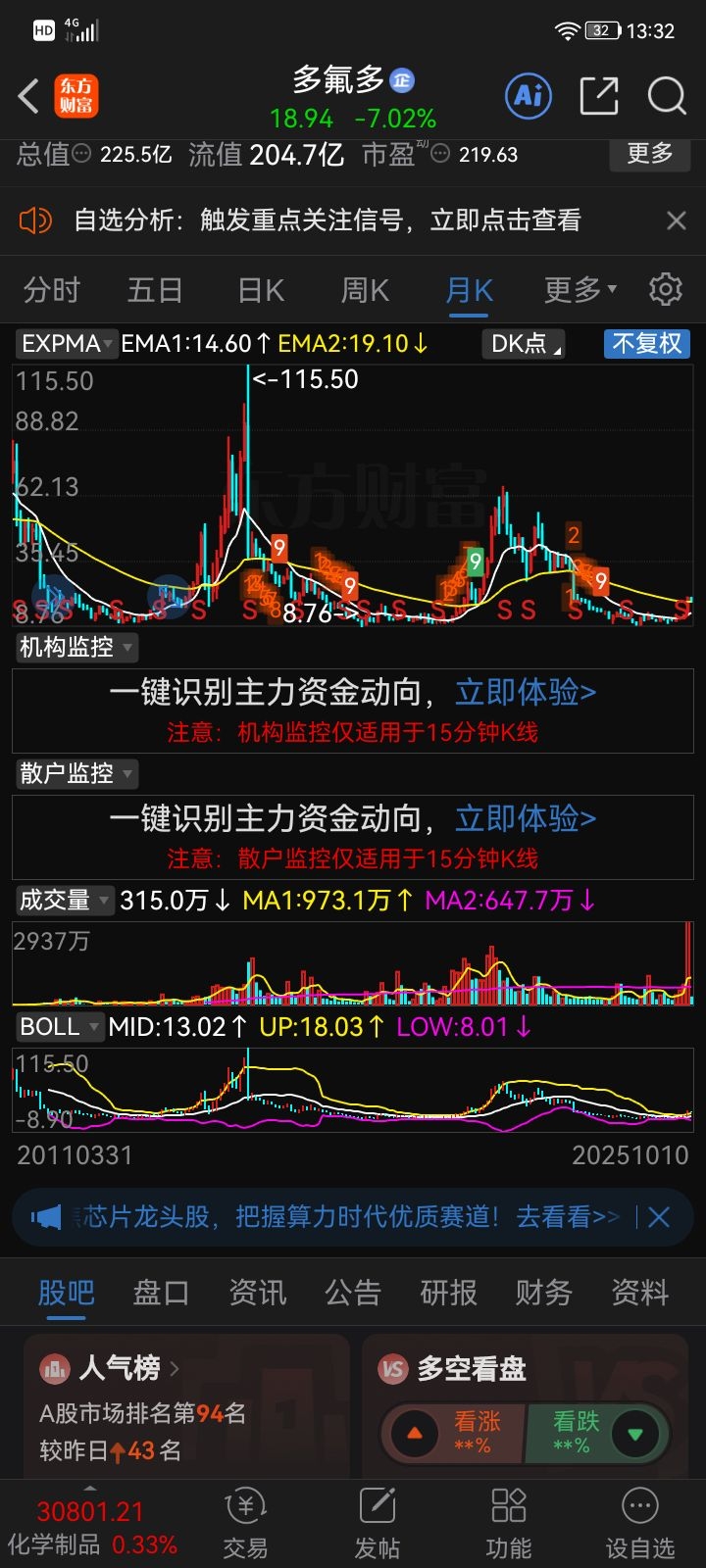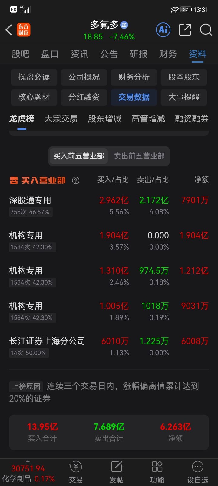 多氟多锂电龙头股价还趴在底部加5家机构扫货6亿多元下午直线垃升红色加仓持股待
