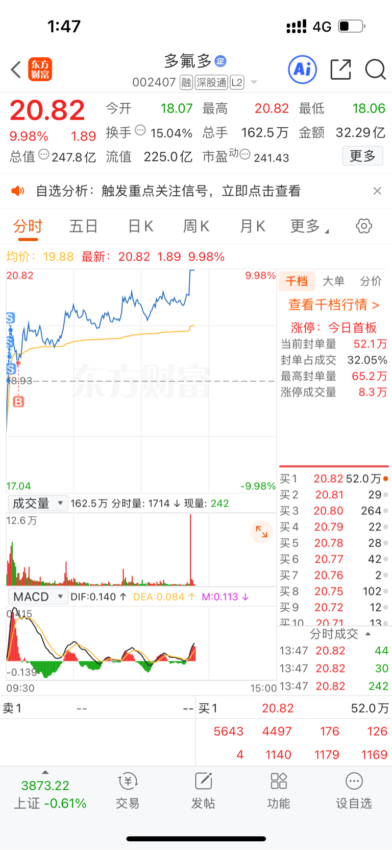 $多氟多(SZ002407)$ 早上踢飞了多半仓没接回来,就剩下底仓了,哎