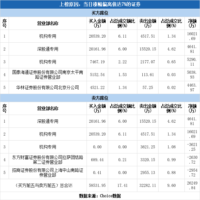 今日龙虎榜单上出现了深股通的身影,占据了买二、卖一的位置,净买入4641.81万元,占当日成交总额的1.38%。