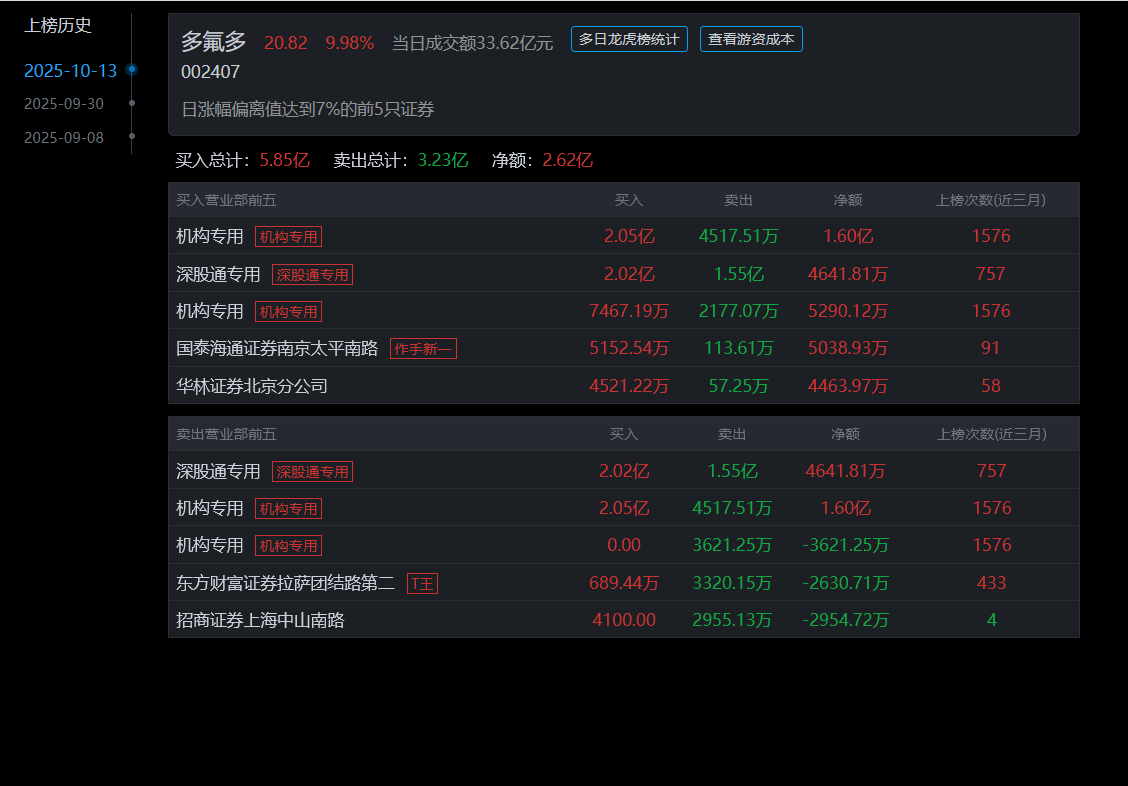 多氟多今日游资龙虎榜席位上榜数据如下!