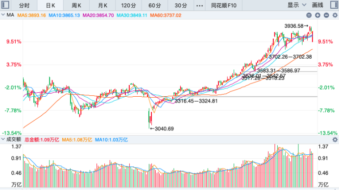 从昨天上证指数的走势情况上来看,出现了探底回升的走势,在3800点获得有效资撑以后,逐步反弹,并且成功战胜了3850,继续向上运行,成交量能够放大。整体来讲,上涨个股家数也是从早盘的100多家逐步拉升到1500家左右,因为量能长期保持在两万亿上方,所以一直都存在着结构性的行情。