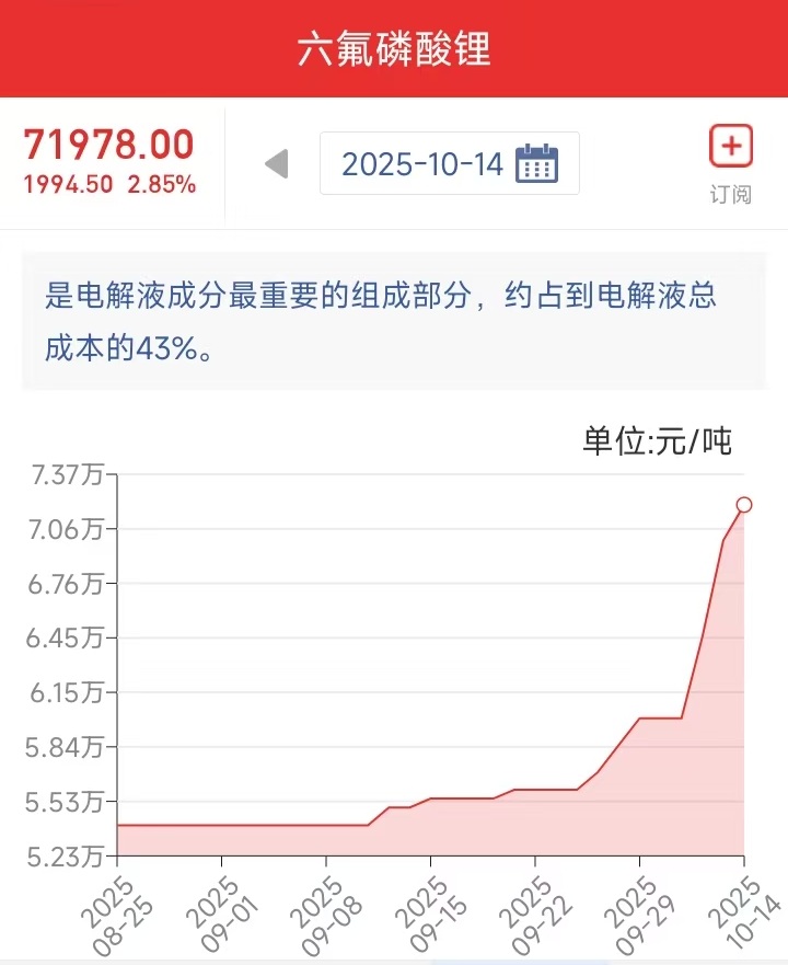 六氟磷酸锂继续大幅上涨。六氟磷酸锂继续上涨,单日涨幅达2000元每吨,龙头多氟多