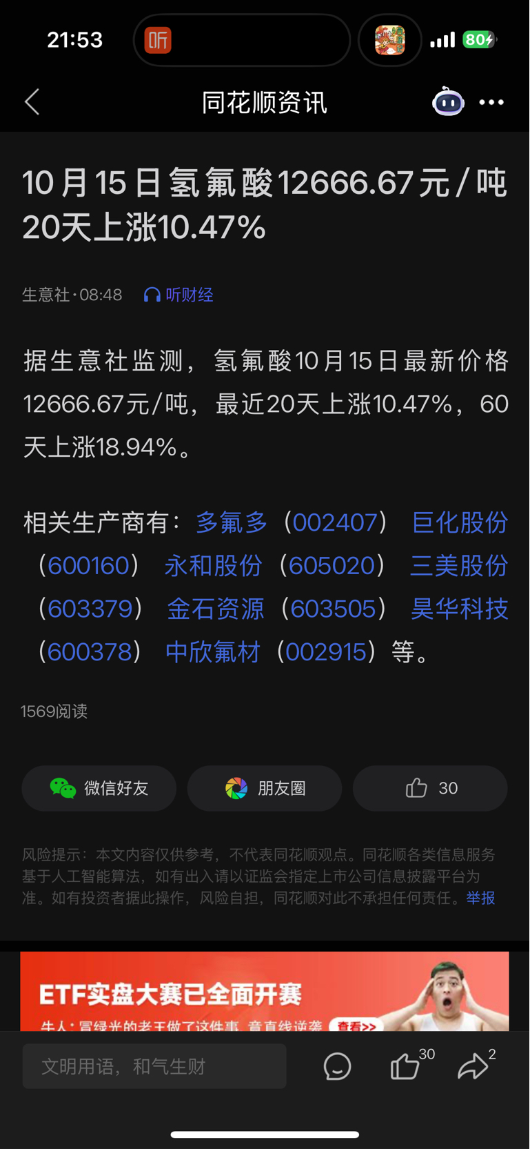 $多氟多(SZ002407)$ 大家都在注意6f涨价,殊不知氢氟酸也涨了不少