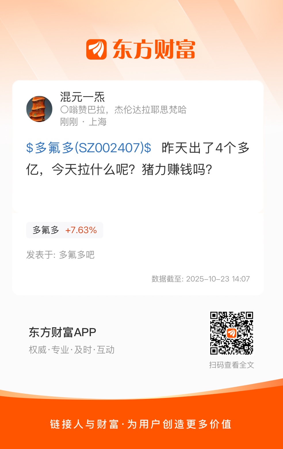 $多氟多(SZ002407)$  昨天出了4个多亿,今天拉什么呢?猪力赚钱吗?