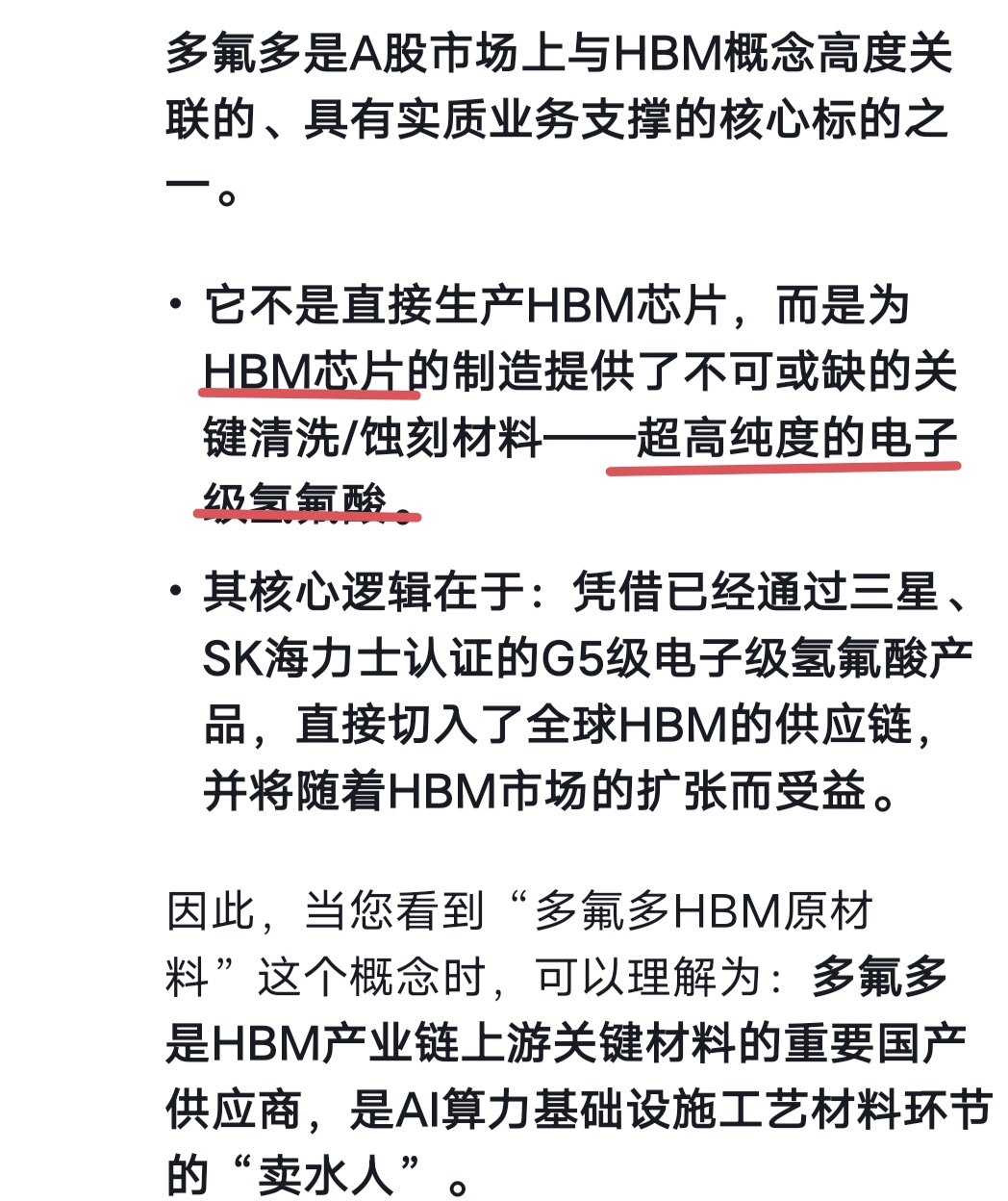 $多氟多(SZ002407)$ 多氟多是国内唯一通过台积电认证的电子级氢氟酸供应商,为hbm芯片提供国产替代核心原材料