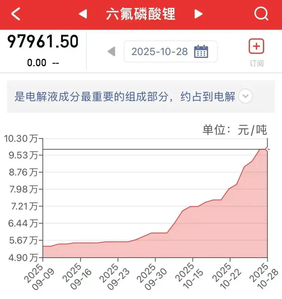 “目前散单市场价格已升至9万元/吨。”多氟多高管日前在业绩说明会上介绍,近期六氟磷酸锂价格上涨,主要由下游新能源与储能产业需求爆发、供给端产能集中且扩产谨慎的供需矛盾及原材料价格波动共同推动,10月份六氟磷酸锂市场需求持续向好,预计年底增速有所放缓,明年六氟磷酸锂价格整体呈上行趋势。