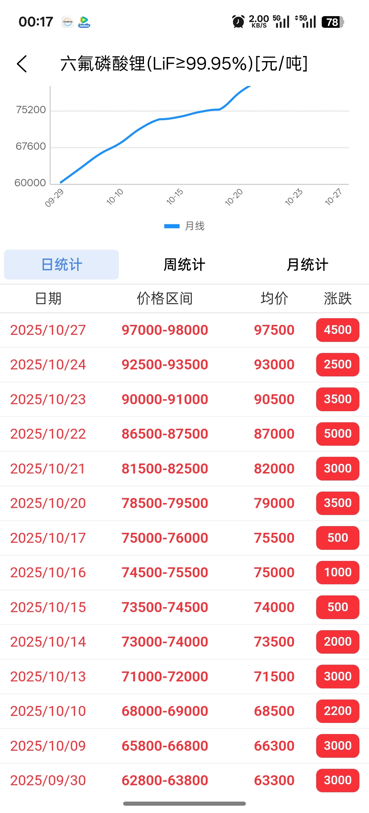 拼多多一千6.5万吨的货,六氟价格从月初的6万多涨到现在快10万,涨幅50%,看