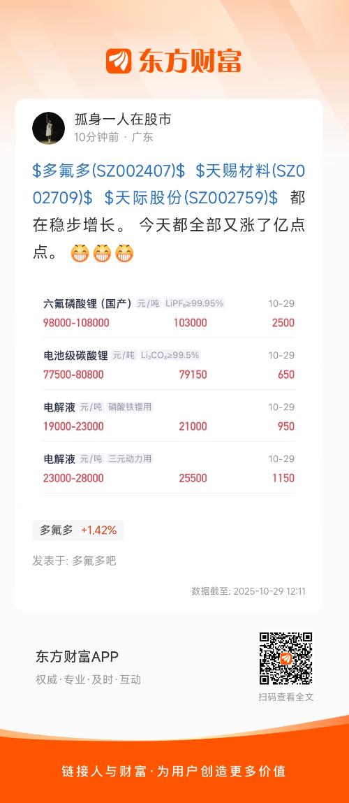 $多氟多(SZ002407)$  $天赐材料(SZ002709)$  $天际股份(SZ002759)$  都在稳步增长。 今天都全部又涨了亿点点。