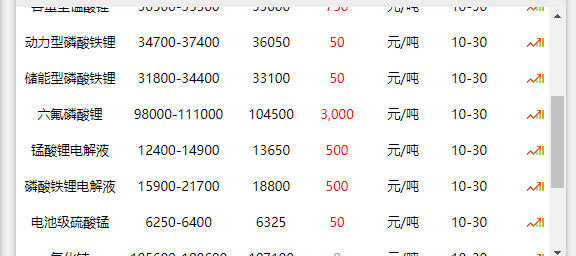 | 六氟磷酸锂 | 98000-111000 | 104500 | 3,000 | 元/吨 | 10-30 |