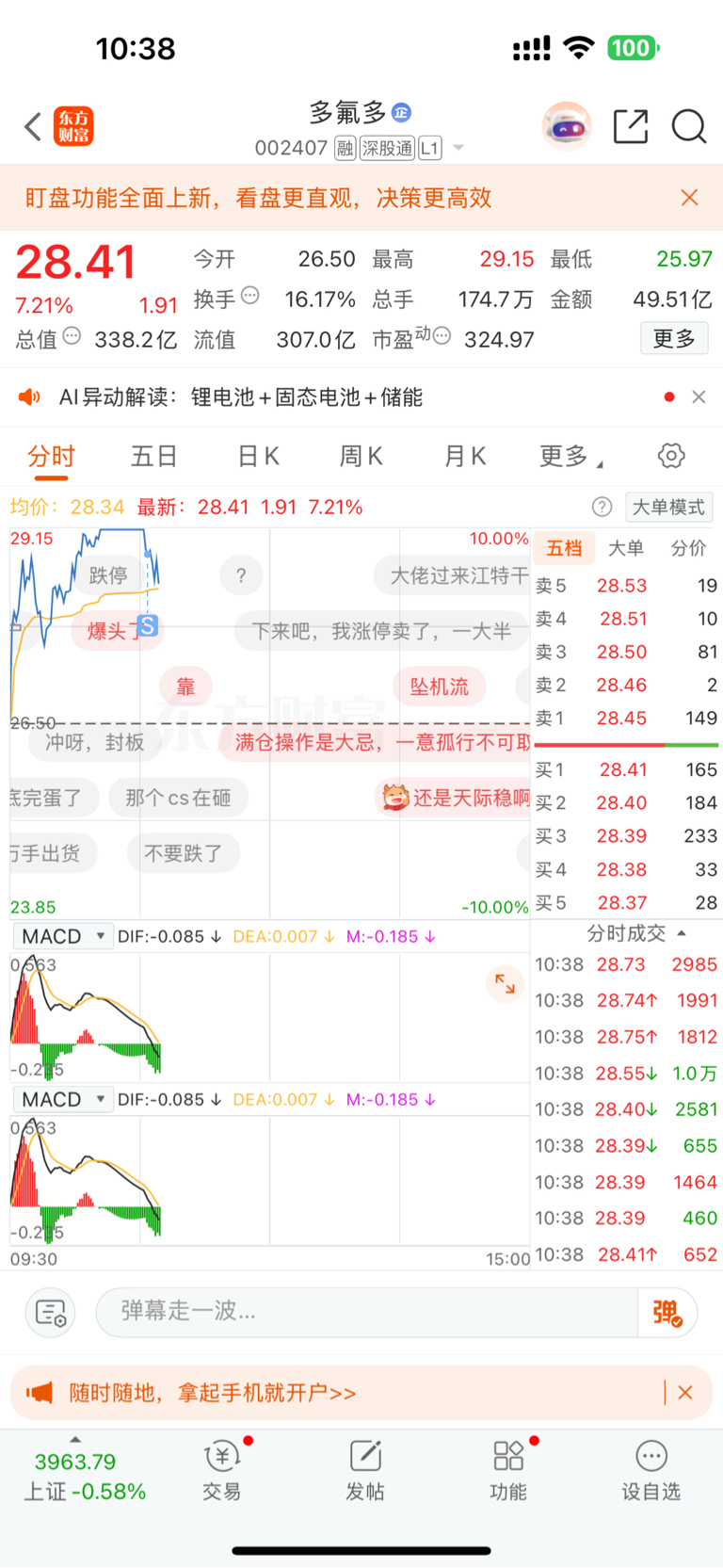 多氟多封板未能封死,见好就收,收益达到了28%,落袋为安。离场休息