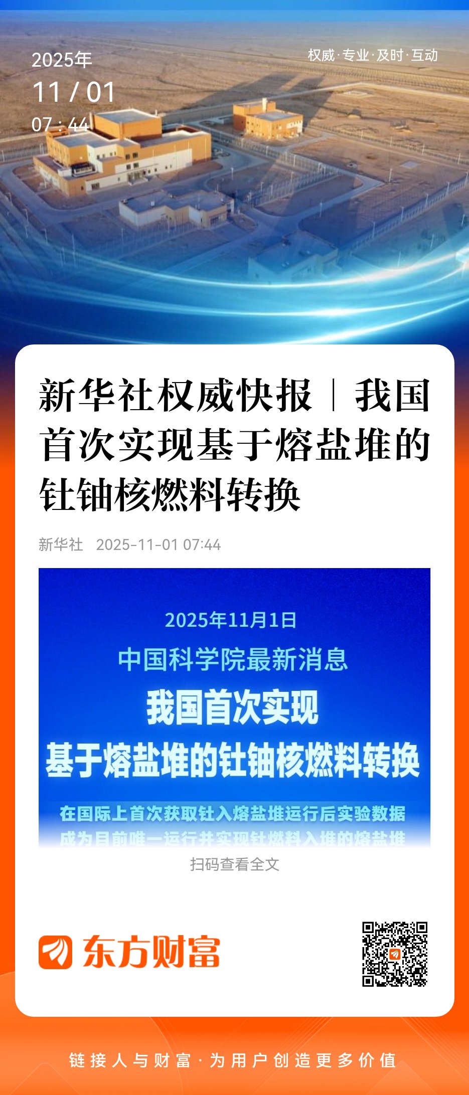这是钍基熔盐堆研发进程中的重要里程碑,为我国未来钍资源的规模化开发利用、发展第四代先进核能系统提供核心技术支撑与可行方案。