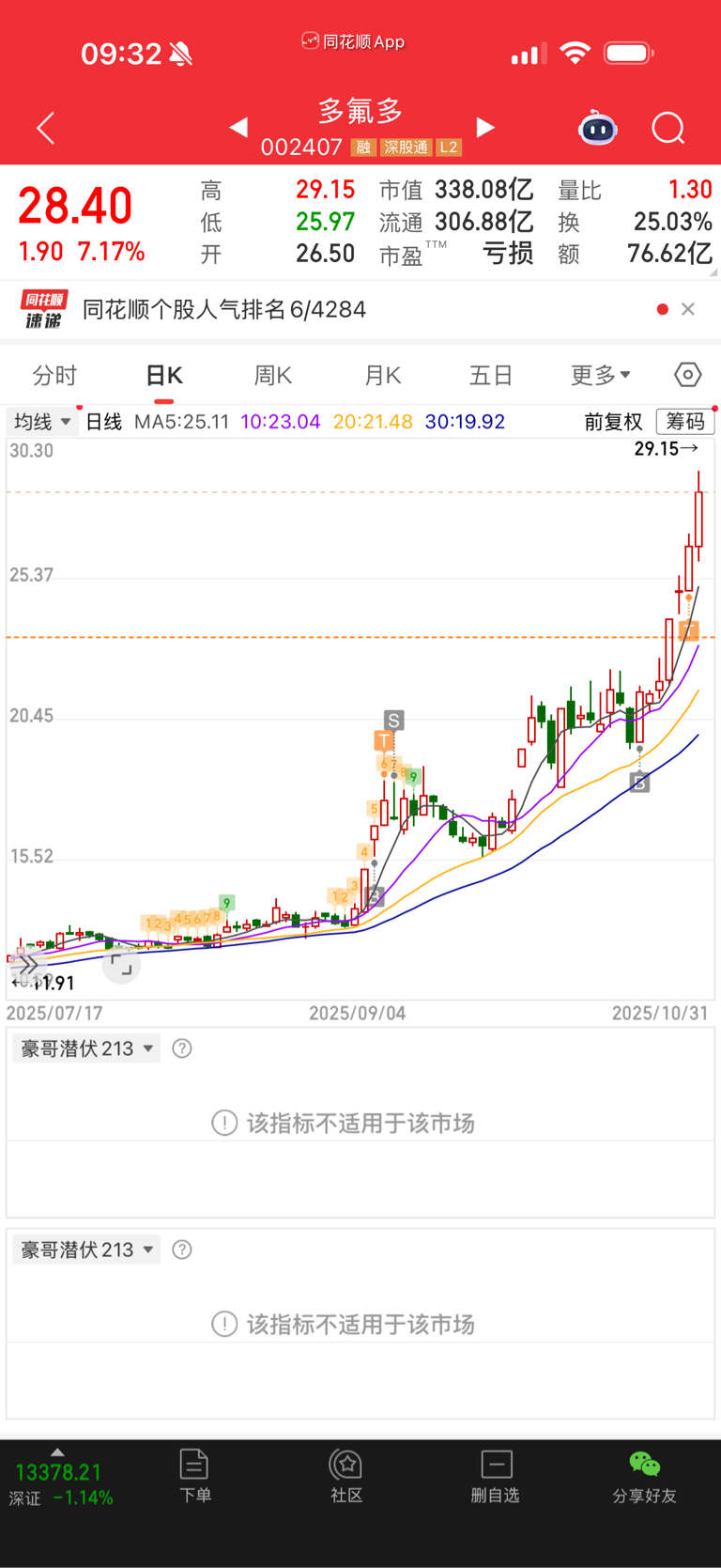 在9月8日买入多氟多,后面没持有几天,盈利一点就跑,后面由于他的走势一直向上,又