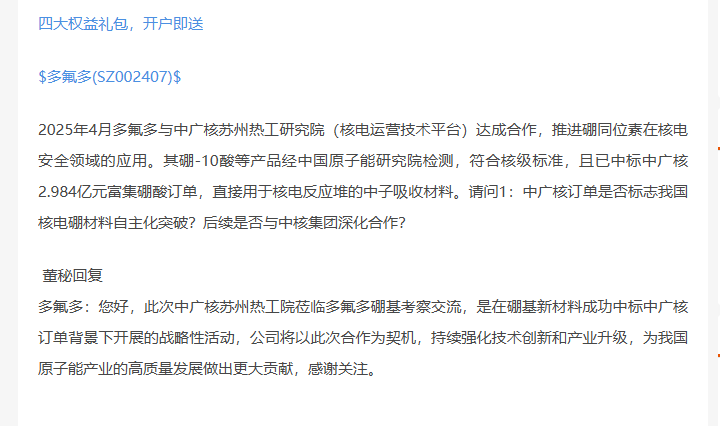 关于跟中广核的合作 我翻到了之前的一个帖子 那么说明什么呢 说明了中广核认可了多多交付的产品 那么 这是近3个亿的合同,虽然不是很多 但是可以说是国内首家啊 一个订单出现 后面的订单也许是在现在可控核聚变 核能等领域的开端,后面订单源源不断啊 真的是个大利好
