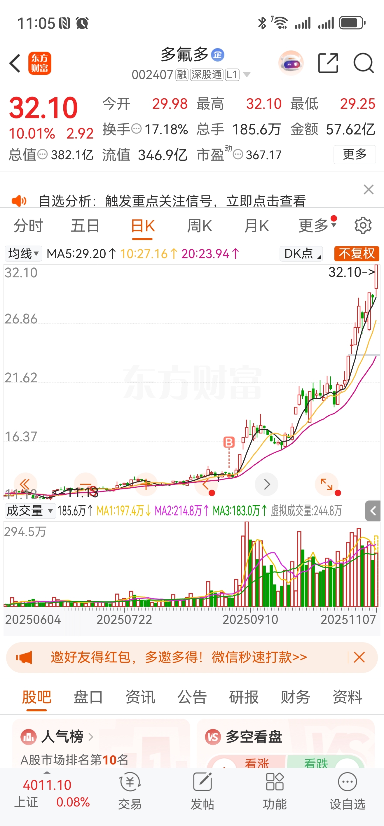 $多氟多(SZ002407)$ 看着还怪爽了,就是胆子太小了,买了太少