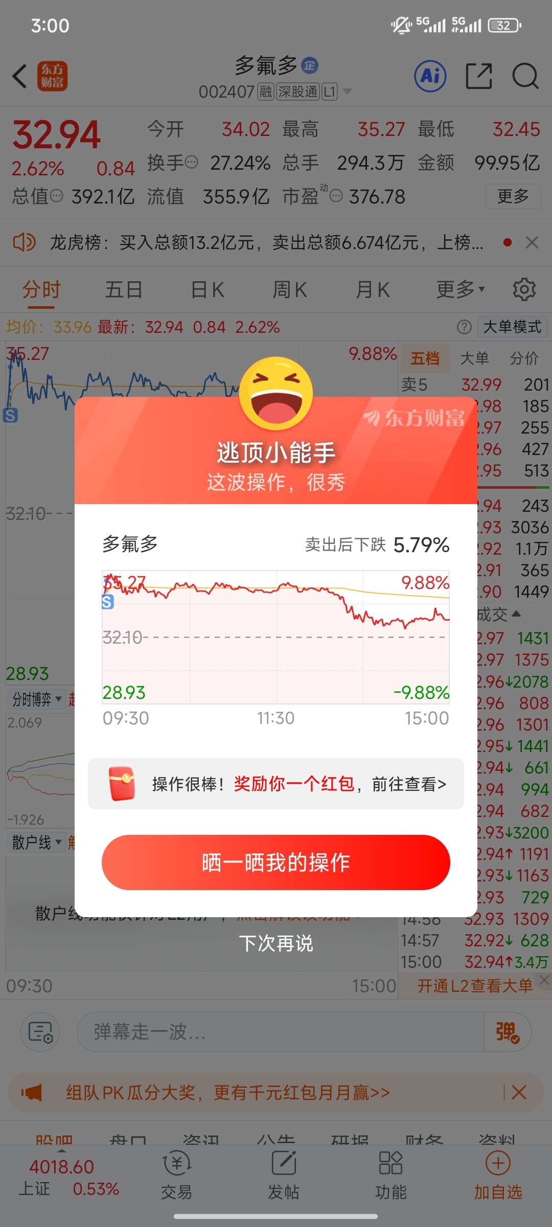 $多氟多(SZ002407)$ 赚了30个点,走了,祝各位留下的发财