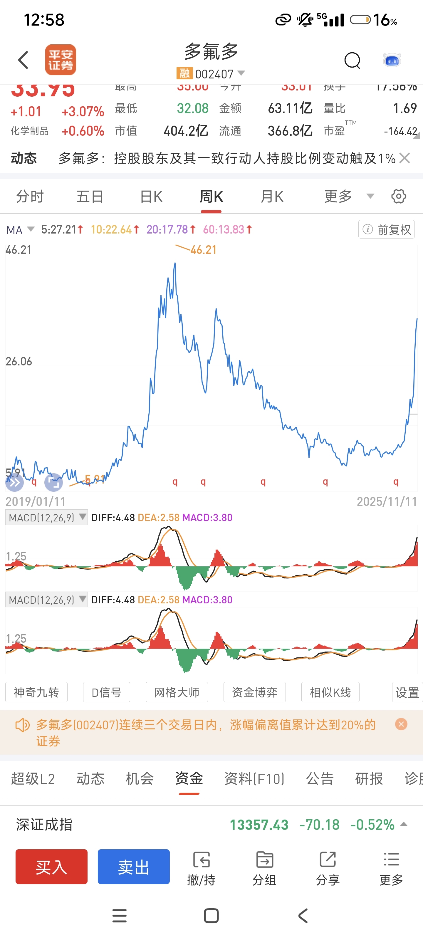 $多氟多(SZ002407)$ 35.6已经是历史第二高点,大资金等着出货。难道大资金变中长线了,怕是不会
