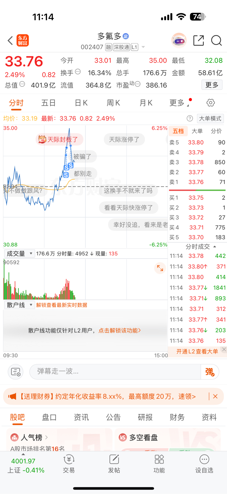 $多氟多(SZ002407)$ 兄弟们,吃一亏长一智,昨天9个多点没跑,今天我跑完了,尾盘接回来