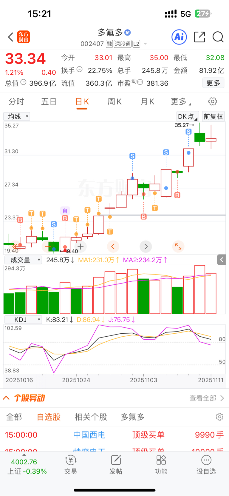 $多氟多(SZ002407)$ 论买领涨龙头的重要性,如果同样10月23号买入天际,天赐,多氟多三个票拿着不动,天际的涨幅是百分之90,多氟多是69,天赐是32,相差巨大,虽然天赐是行业龙头,但是盘子大了资金不拉也没办法,大部份人应该都看的出来这三个票的地位,但是还是依然有很多人怕高选择天赐,还是得买主动的