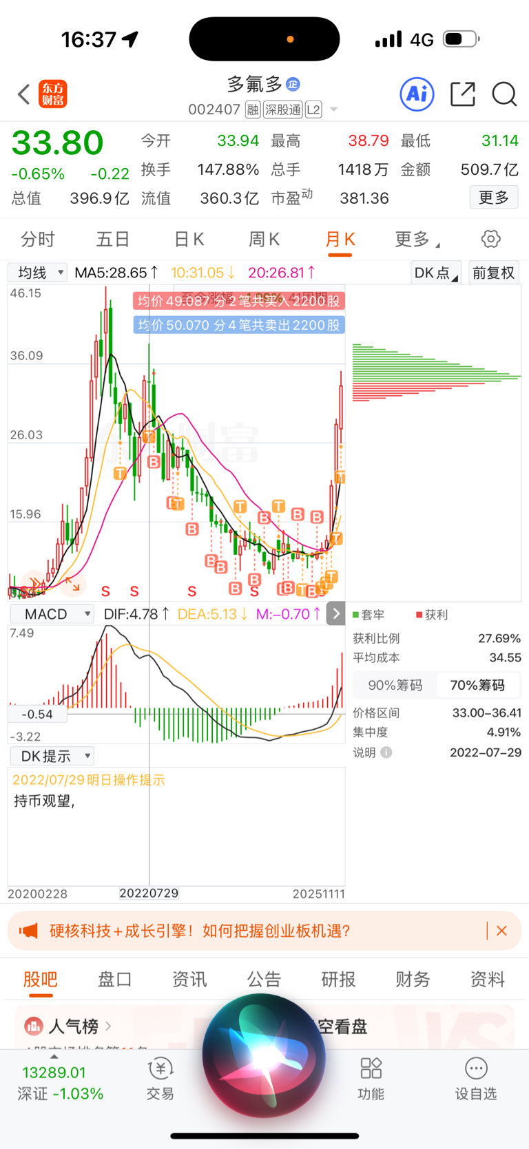 $多氟多(SZ002407)$ 这个位置前期密集交易区,套牢盘巨大