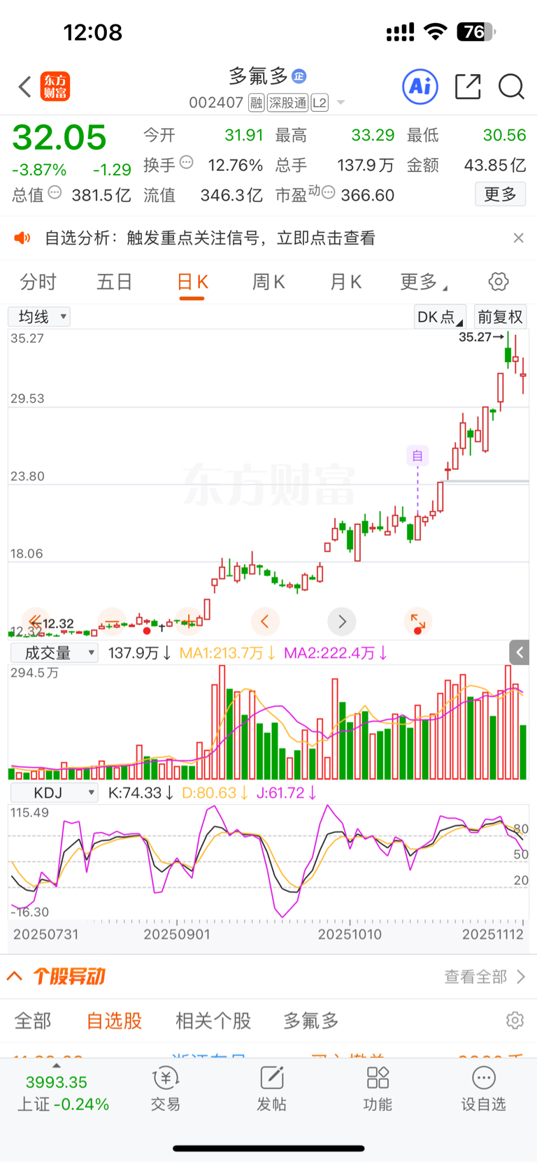$多氟多(SZ002407)$ 再没有破前高35.27之前这个票现在只适合轻仓低吸,也许现在入比再次破前高35.27性价比更高,但是突破上去并稳住的确定性更高