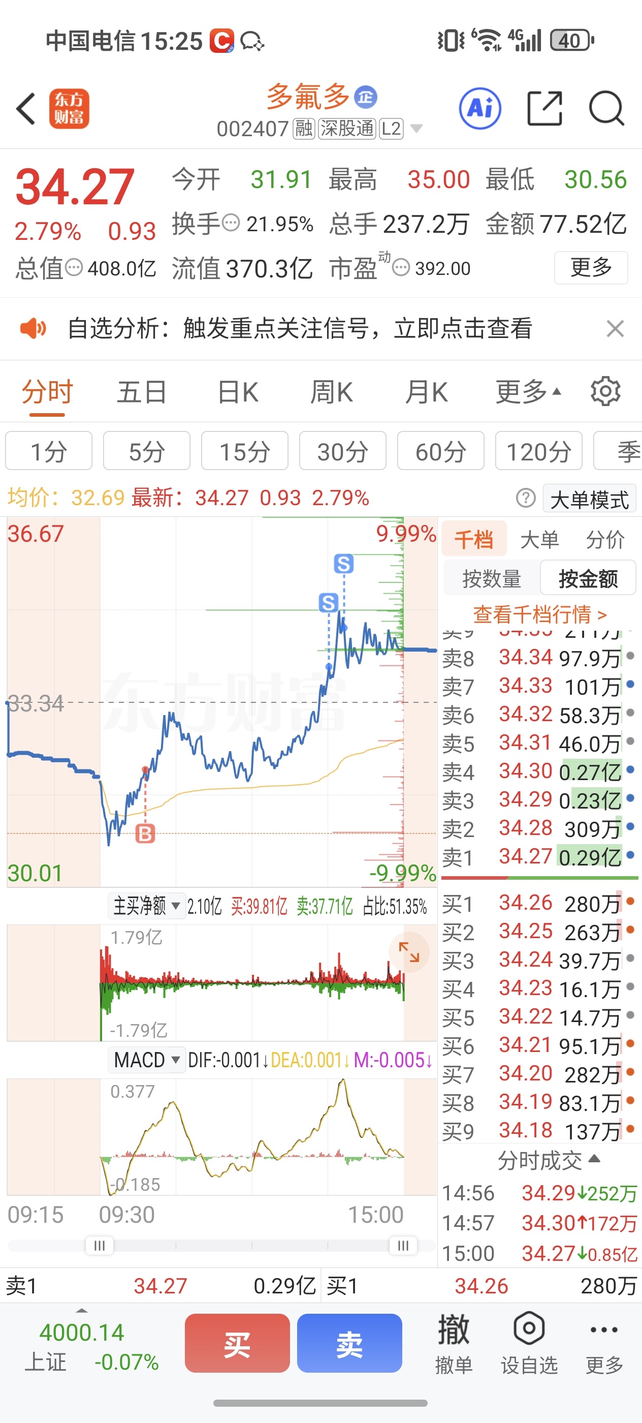 $多氟多(SZ002407)$ 感谢多多和天际俩兄弟,今天水下拼命买,不然今天绿油油的,感谢两支票的主力...