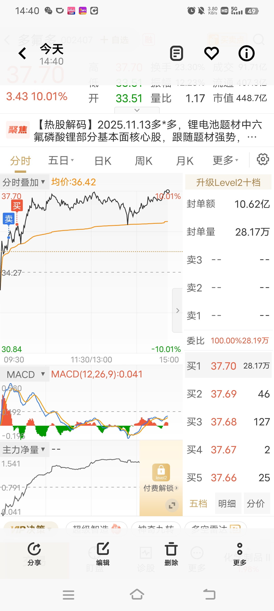 $多氟多(SZ002407)$ 发现不对劲就高位买回来,唉,差一分钟而已,也想买天际的。提心吊胆一天