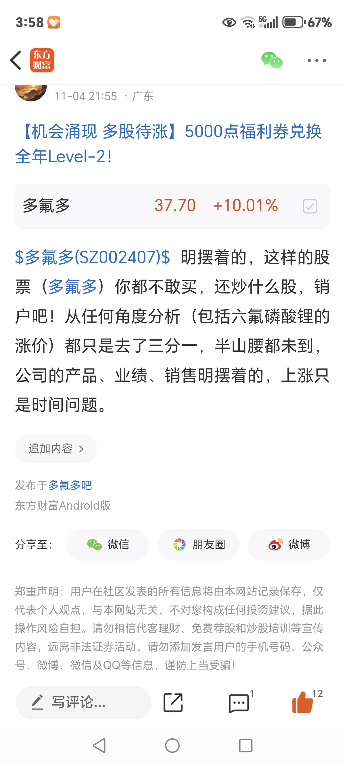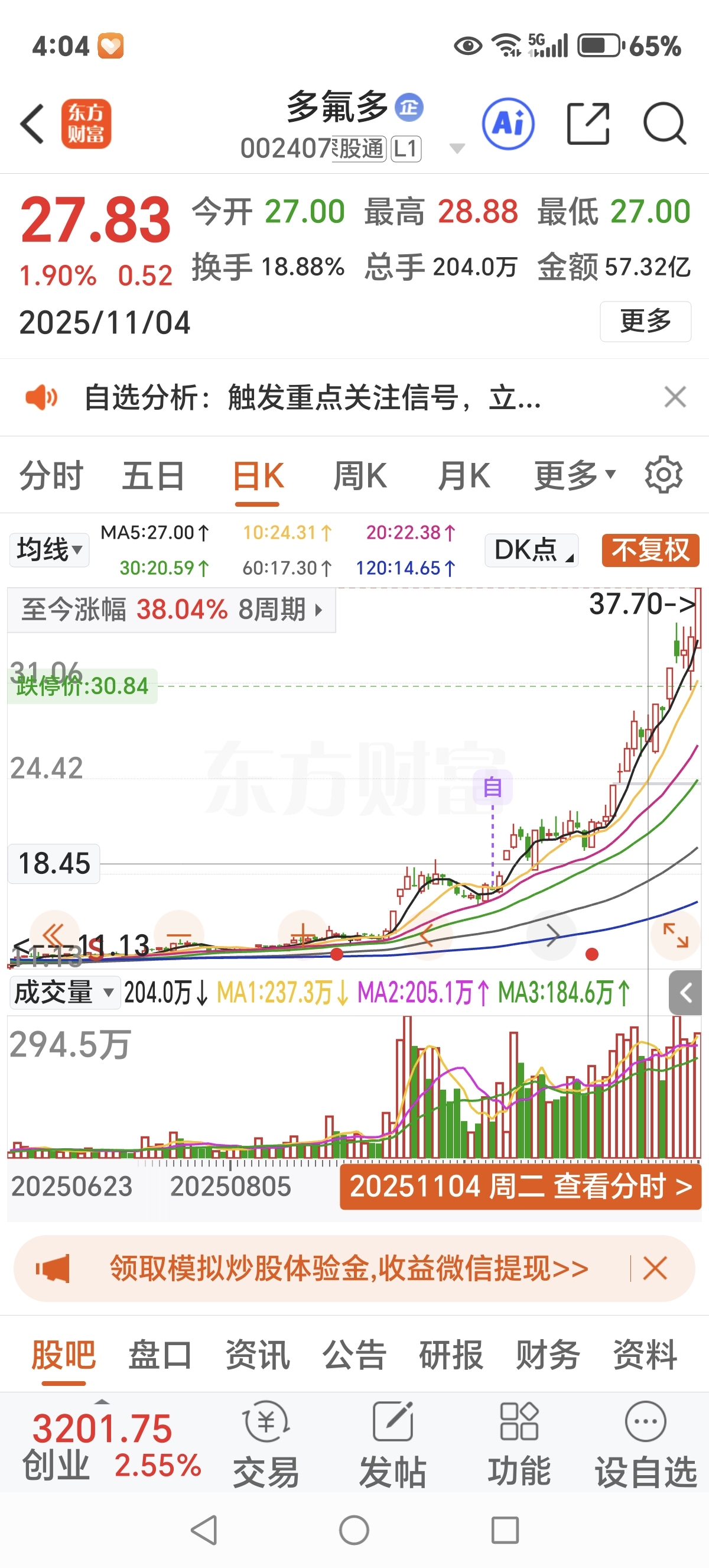 $多氟多(SZ002407)$ 立贴为证,11月4日(当时收盘价27.83元)已叫大家大胆买入的了